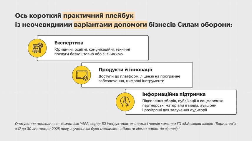 Показово, що 90% військових назвали надання компетенцій одним із найцінніших форматів підтримки поруч із прямими пожертвами. Бізнес часто не усвідомлює, наскільки цінна його експертиза. Юрист може проконсультувати безкоштовно, маркетолог — пояснити, як будувати комунікацію, розробник — допомогти налаштувати програмне забезпечення.