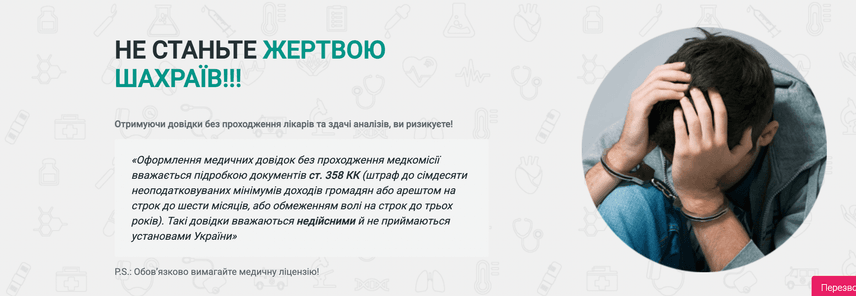 Їду в наступний заклад — медичний центр «Медсп****и» в Оболонському районі Києва. На головній сторінці їхнього сайту бачу попередження, чому не можна отримувати меддовідки без проходження лікарів і здачі аналізів та яка за це передбачена відповідальність. Кумедно, бо саме тут я «пройшла» психіатра, якого не було. А з аналізів здала лише експрес-тест на наркотики.
