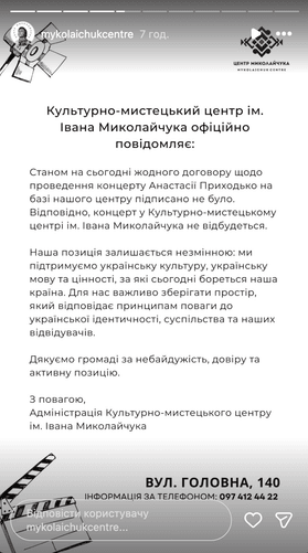 На тлі скандалу Культурно-мистецький центр Миколайчука заявила, що не підписувала жодного договору щодо проведення концерту Приходько, тож заходу не відбудеться.