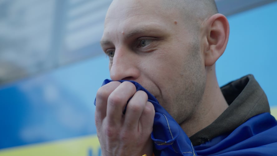 «Повітря моє. Сонце моє. Я мріяв про це! Оцього прапора не вистачало!» — додає, цілуючи шматок синьо-жовтого стяга, у який він загорнутий.