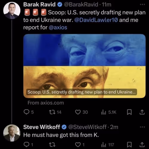 Коли журналіст Axios опублікував в X свою новину про новий мирний план, Віткофф, як стверджується, відповів з офіційної сторінки: «Він, мабуть, отримав це від К.». Це повідомлення швидко видалили. Журналісти припускають, що Віткофф думав, що надсилає особисте повідомлення, а зазначеним «К.» може бути Кирило Дмитрієв.