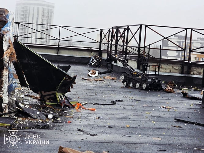 Там залишився пошкоджений дрон, його бойова частина, а також 21 касетний боєприпас. Ще одна небезпечна «касета» перебувала у дворі будинку. Ці касетні елементи могли вибухнути будь-якої миті, для того щоби зібрати небезпечні елементи ДСНС використали дрони й багатофункціонального робота, зокрема й на даху будинку.