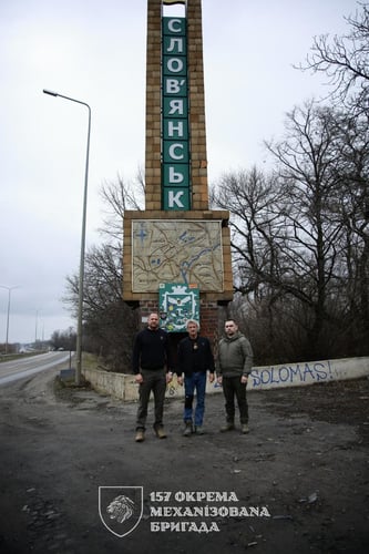 На фотографіях, які опублікували військові, видно, що разом з актором до військових приїхав колишній керівник Офісу президента Андрій Єрмак. На одній зі світлин вони разом стоять біля стели на в’їзді до Слов’янська.