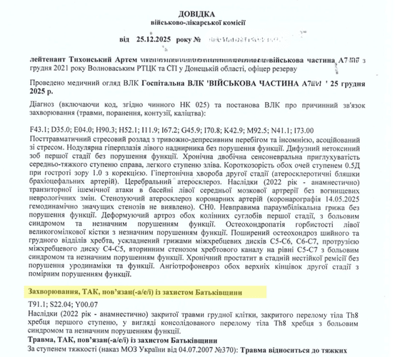 Водночас Тихонський показав нам висновок ВЛК від 25 грудня 2025 року, де значиться, що йому для лікування дають відпустку на 30 днів. 6 січня його шпиталізували до приватного медзакладу «Реабілітаційна клініка “Святенко”».