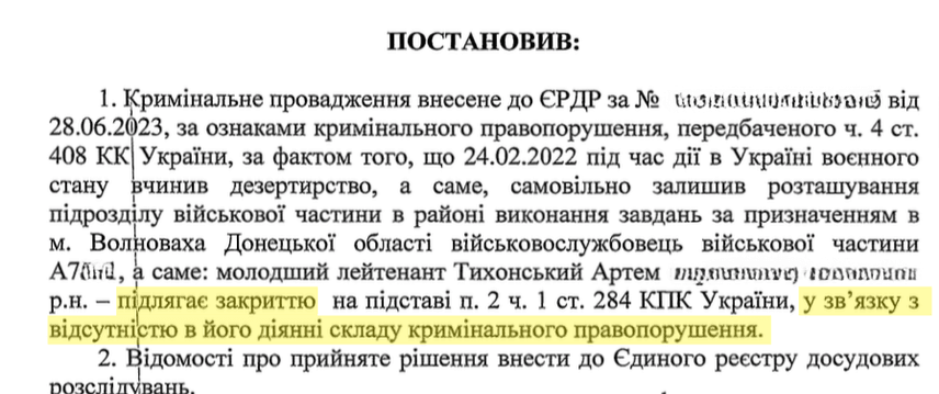 У постанові слідчий звернув увагу на суперечності в матеріалах службового розслідування. Зокрема, в акті йшлося, що відсутність Артема помітили під час шикування о 18:00 24 лютого. Водночас опитані слідчим свідки з військової частини розповіли, що бачили Тихонського в період із 18:00 до 19:00.